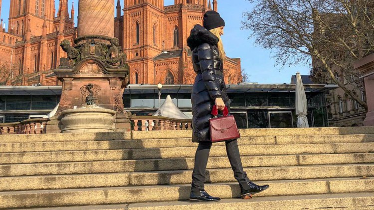An diesem Tag war es sehr kalt, da habe ich mich warm eingepackt in meinen Daunen Mantel. Außerdem trage ich eine dünne Kaschmir Mütze und die dunkelrote Tasche von Sassy Classy.