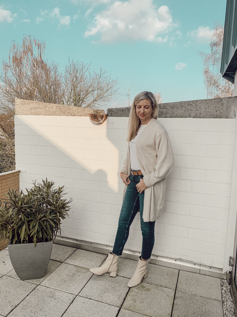 Cardigan: H&M, Gürtel: Hugo Boss, Hose: Calvin Klein, Stiefel: Vagabond