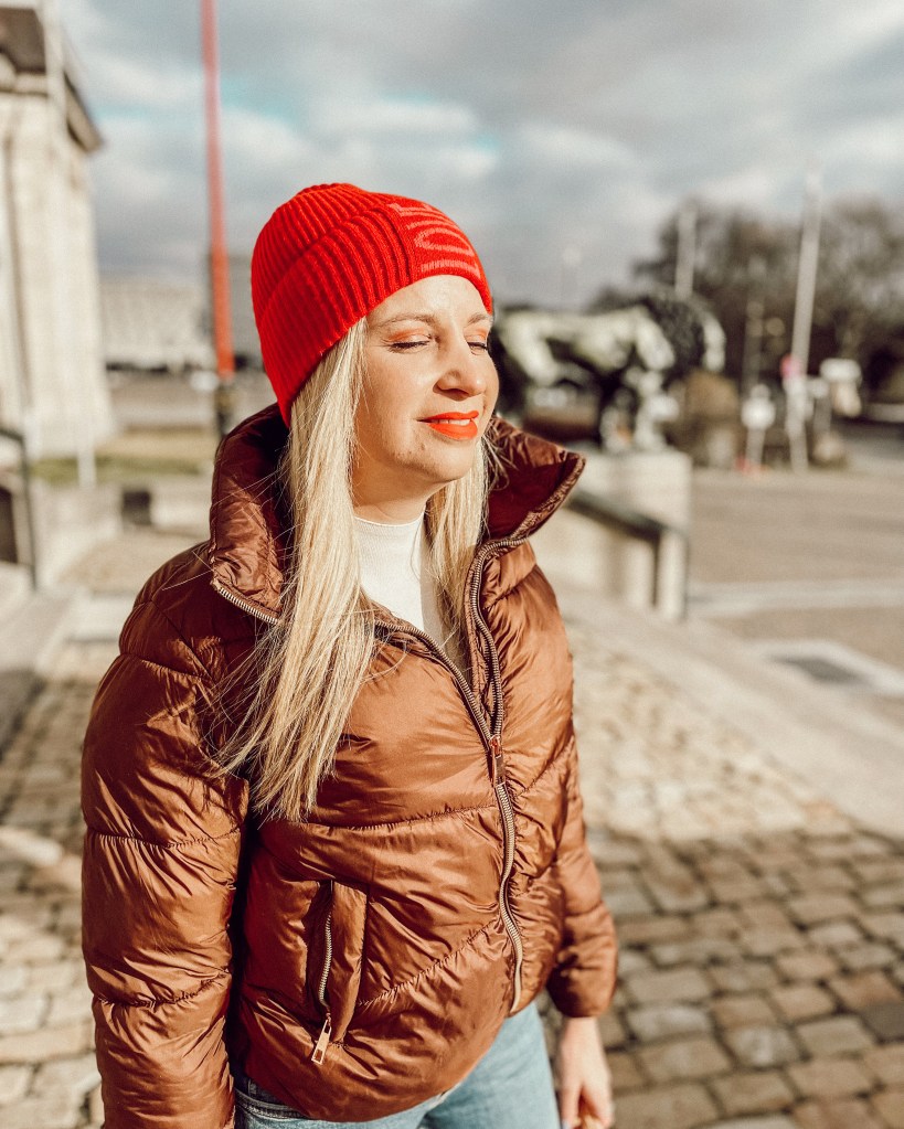 Heute möchte ich Euch zeigen, wie Ihr einen Farbtupfer in Euer Winteroutfit bringt. z.B. mit einer roten Mütze. Diese habe ich mal bei P&C gefunden und mein Mann hat sie mir zu Weihnachten geschenkt. Dazu trage ich eine braune Jacke von H&M.