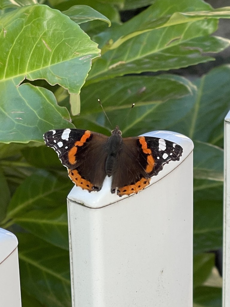 Unterwegs traf ich noch alte Bekannte, und als wir uns unterhielten, war der Schmetterling plötzlich wieder da. Er landete auf dem Gartenzaun, neben dem wir standen, und ich hatte die Chance, ein Foto zu machen.