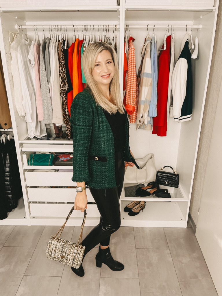 Blazer: Zara, Basicshirt: H&M, Lederleggings Thermo: Calzedonia, Stiefeletten: Buffalo, Tasche: Guess über Zalando