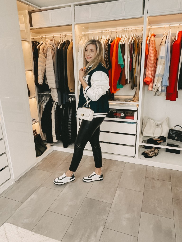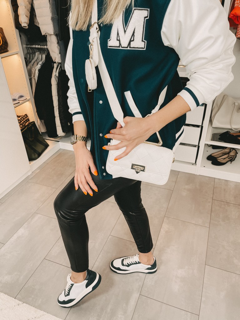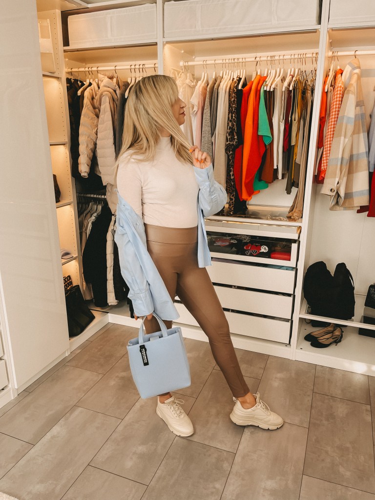 Hemdjacke: H&M, Rollie: Na-ked, Lederleggings Thermo: Calzedonia, Sneakers: Copenhagen, Shopper: Copenhagen, Babyblaue Tasche: Liebeskind